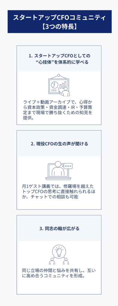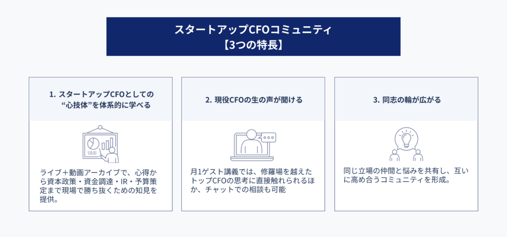 国内唯一の「スタートアップCFOコミュニティ」を運営し、トップCFOとの交流や実務知識の習得、仲間との繋がりを支援しています。